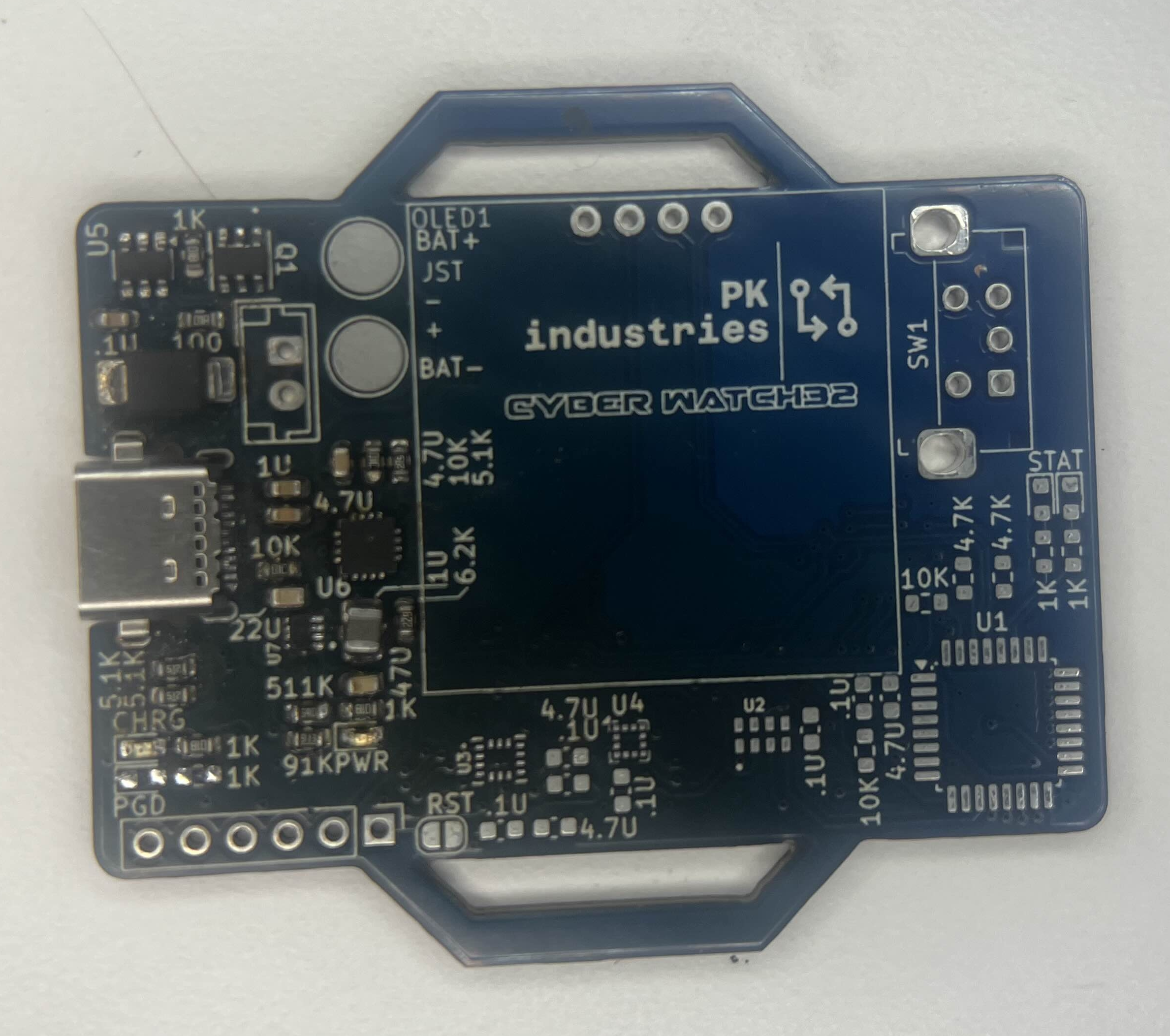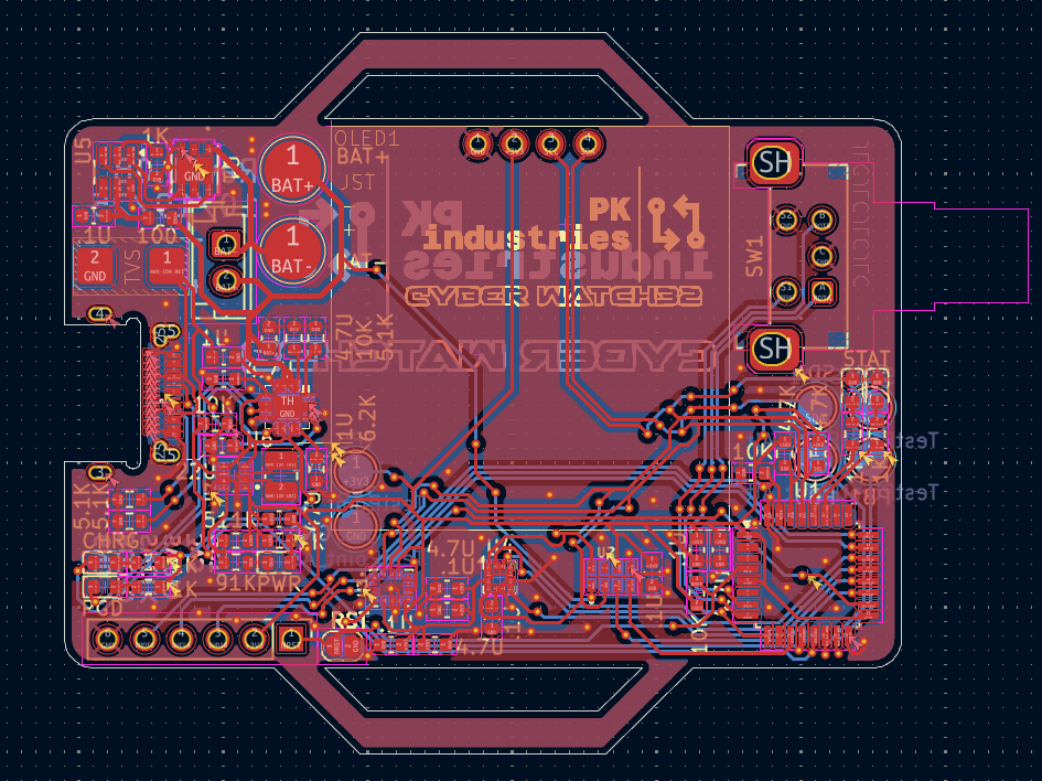 After designing the entire board once already, I was determined to make this board the best possible and take my time so I didn't have to have a 15 day+ delay from ordering and shipping the PCB. The board is sectioned off into power management on the left side, and logic on the bottom right. There are a lot of traces on the board, with all but 6 pins of the MCU being used. In total 140 vias are used and everything just barely manages to fit in 2 layers. There are also cutouts in the top and bottom for a watch strap.