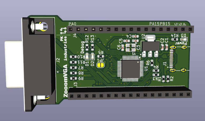 The ZooomVGA is an STM32F103C8 devboard with VGA out. Designed in 7 hours of work, over a total time of 22 hours. Designed to fit in a breadboard and costing only $35.