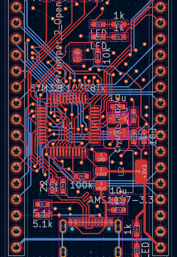 After joining the call an hour and a half late, I realized the race had been cancelled, but not wanting to waste a good idea, I went through the design process. The schematic was very easy to make. This version of the STM32 has built in USB support and the lack of battery meant that this board has relatively few components.